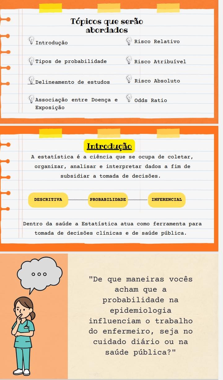 No dia 10 de novembro, a Comissão de Ensino, como parte de suas atividades de aprimoramento acadêmico, realizou uma aula expositiva e dialogada focada nos temas de Probabilidade e Risco para os estudantes do quarto semestre do curso de Enfermagem, na disciplina de Epidemiologia. A iniciativa surgiu da percepção da própria Comissão de que esses tópicos, cruciais para a compreensão da saúde pública, não haviam sido totalmente assimilados pelos petianos quando cursaram a disciplina. Assim, o objetivo foi criar uma apresentação de slides que, embora alinhada com o conteúdo programático da professora, oferecesse uma abordagem didática e aprofundada, visando um entendimento mais sólido e prático por parte dos alunos. A aula cobriu os conceitos fundamentais de Probabilidade, os delineamentos de estudos epidemiológicos essenciais, a associação entre doença e exposição, e os diversos tipos de riscos utilizados na prática epidemiológica. Para exemplificar essa dinâmica, os petianos lançaram um questionamento crucial: "De que maneira a probabilidade na Epidemiologia influencia o cuidado do enfermeiro, seja no cuidado diário ou público?". Os alunos do quarto semestre demonstraram grande participação e realizaram respostas pertinentes, que foram prontamente esclarecidas e aprofundadas pelos petianos de forma satisfatória e didática, incluindo a menção a elementos como o uso de dados, a correta interpretação de riscos e a capacidade de gerir um cuidado melhor.